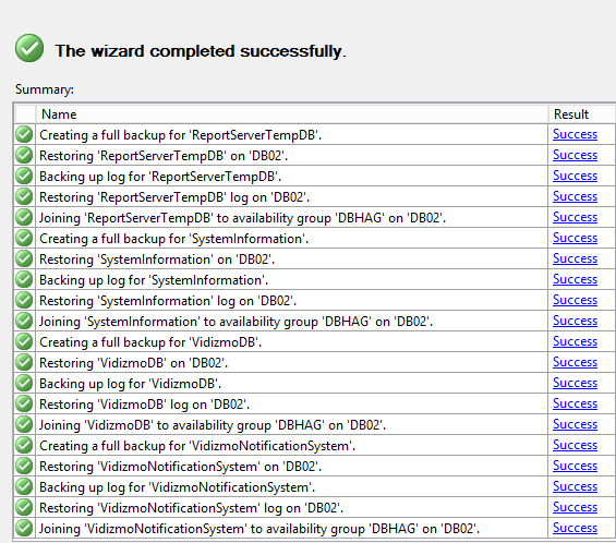 7. In the last step, it will Restore and join all the Databases to the other Replicas. Click “Close”.