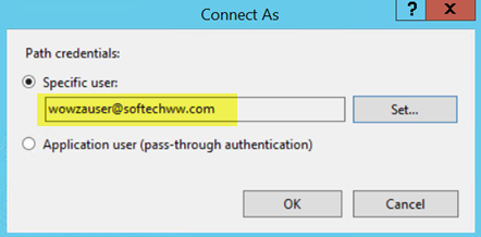 9. Click on “Connect as” and provide user credentials of the user having “Full Control” permissions over the network path. Make sure to provide full username including the domain name. In this case, the username is “wowzauser@softechww.com”
