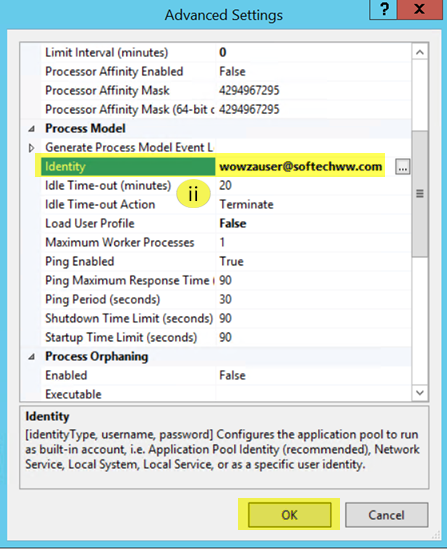 ii. Change Identity value from “NetworkService” to the Domain user having “Full Control” on network share folder (again in this case the user is wowzauser.softechww.com) and click on the “OK” button to continue.