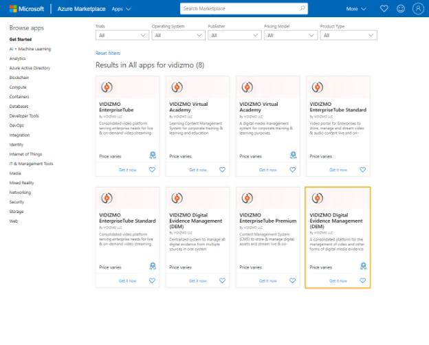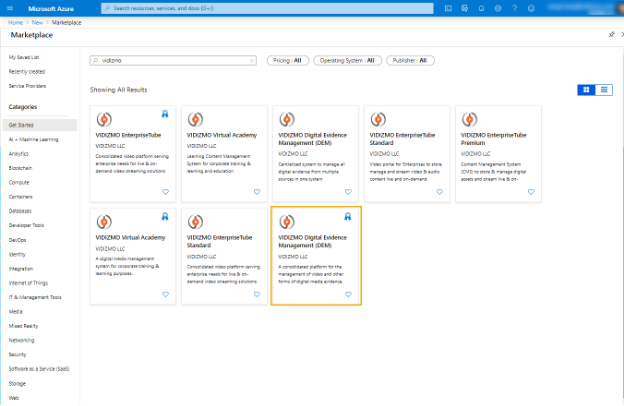 b. Search for VIDIZMO and select the required product package (VIDIZMO Digital Evidence Management - DEM) in this case.