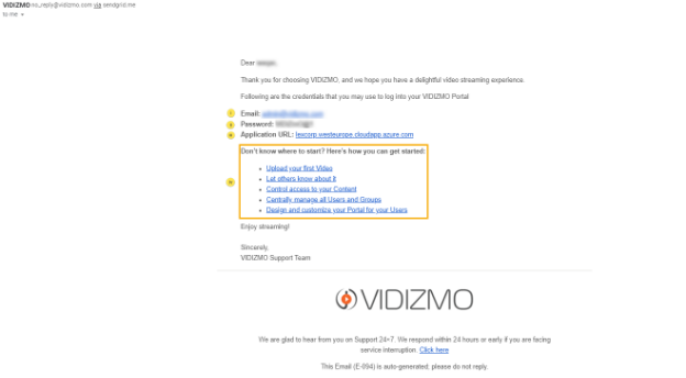 12. When the deployment is successful, you will receive an email from VIDIZMO. This e-mail will have;