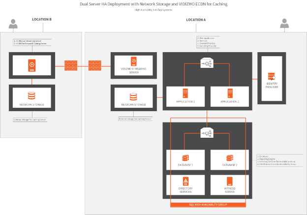 The diagram below shows how VIDIZMO application, SQL High Availability Group, and the Network Storage is used in two different locations secured behind firewalls: