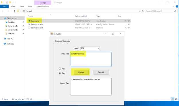 Encrypting database password using a utility before entering it into the registry: