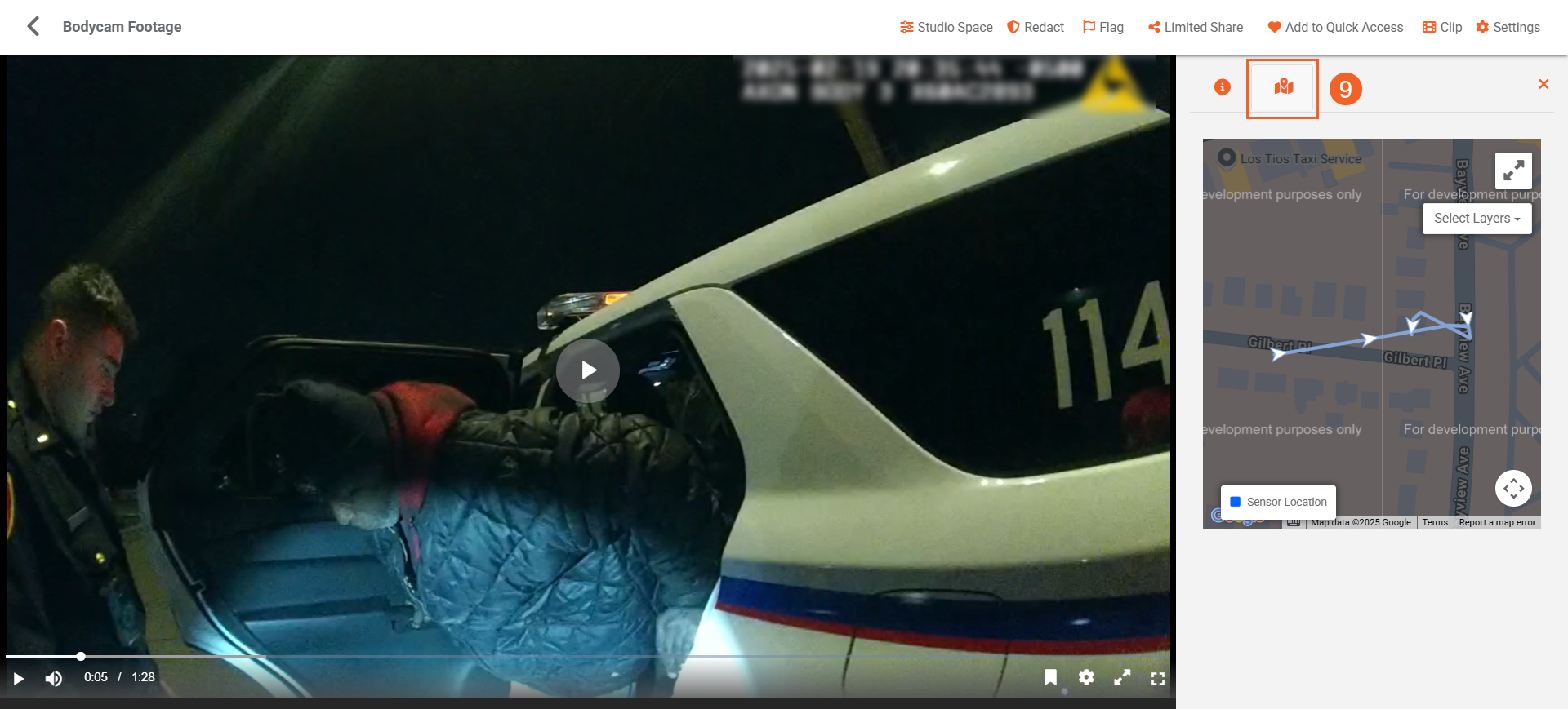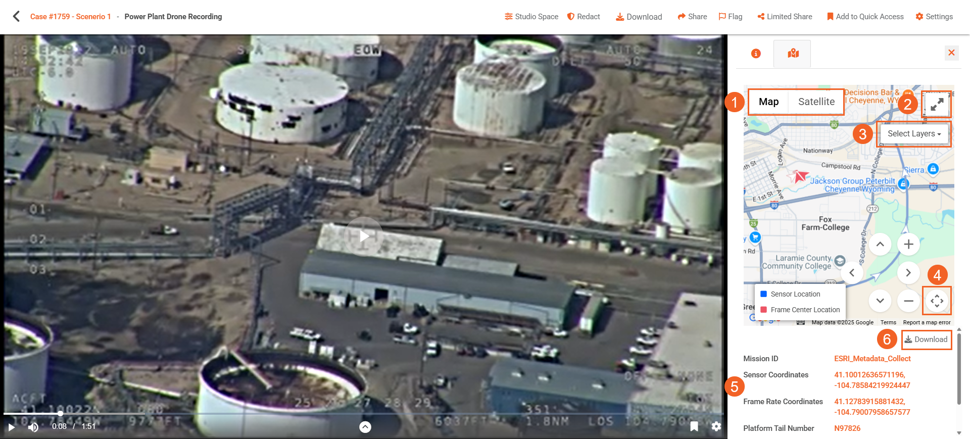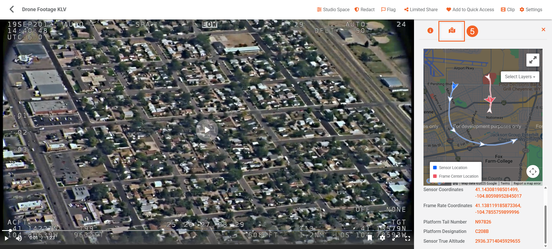 - Use the Select Layer button to visualize the trajectories of the source (e.g., drone or bodycam) and target (object being tracked) on the map. The available layers (also visible on the bottom-left of the map) are: i. Sensor Location: Displays the trajectory of the recording device, such as a drone or body camera. This path is shown as a blue line on the map. ii. Frame Center Location: Displays the trajectory of the tracked object or target captured by an embedded sensor. This path is shown as an orange line on the map.