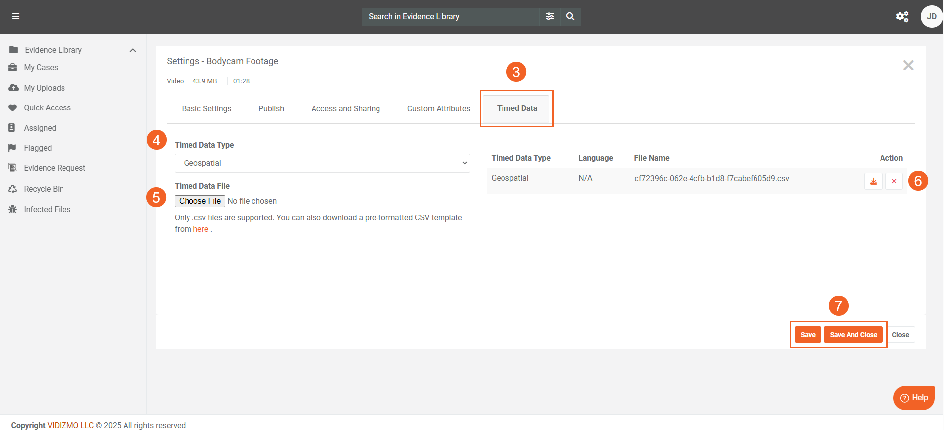 .vttand.srt) ii. Geospatial (available for video, image, and document files, supports.csv) - In the Timed Data File section, select Choose File, and then upload your timed data file. You can also download a pre-formatted CSV template if you wish.