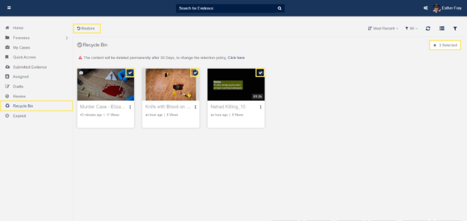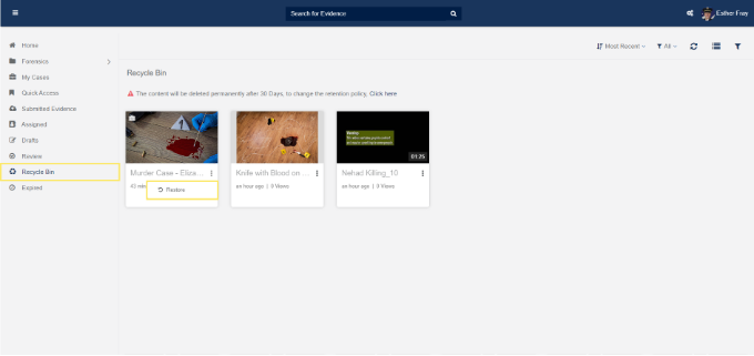VIDIZMO's DEM works as a secure vault for Law Enforcement Agencies for storing their evidence data in a systematically arranged manner. It allows officers to delete the evidence whenever the case has been closed. However, there is a chance that the evidence is mistakenly deleted. Hence, for the purpose of maintaining the integrity of digital evidence, VIDIZMO allows investigative officers to restore the evidence from Recycle Bin within a specific time period. Officers can also manually set the period for retention of the evidence.