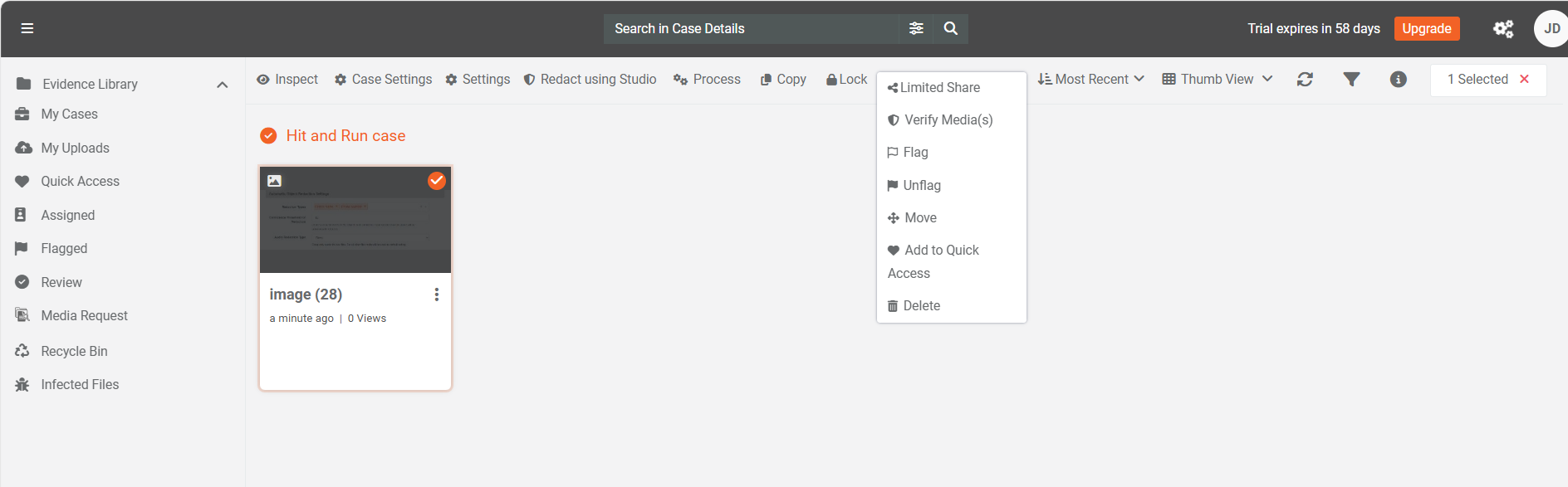 You can also perform bulk actions using the available shortcuts in the header. These shortcuts include: Redirect Using Studio, Process, Copy, Lock, Limited Share, Verify Media, Flag, Unflag, Move, Add to Quick Access, and Delete.
