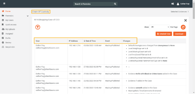 i. You will be able to view all actions performed on that Case with User, IP Address, Date and Time, Event and Changes information.