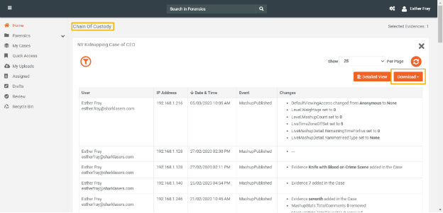 i. Click on the Download button, available on the top-right corner of The Chain of Custody Screen, to download the complete audit trail of the selected Evidence. Here you can toggle between PDF/CSV format to be downloaded.