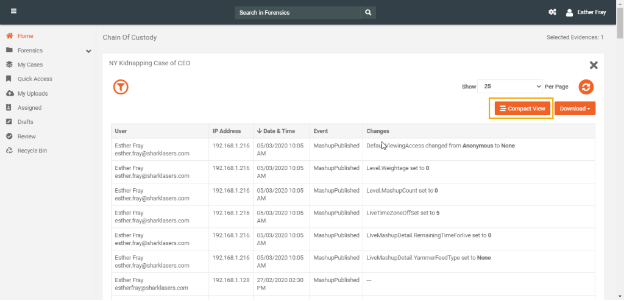 By default, VIDIZMO DEM provides the Detailed View of Chain of Custody, as seen in the above pictures. This view segregates changes against each event. While the Compact View displays the bifurcation of each change against an event as shown in the picture below. You can toggle between different views by clicking on the Compact View button available at the left-hand side of the Download Button.