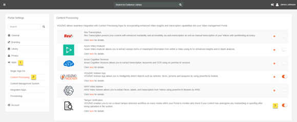 Note: Tamper detection will start working (which means start storing the hashes of content), on the newly uploaded media, once the app is enabled. Tamper Detection will not identify any content tampered before enabling this application (since the hashes were not stored at that time to be compared). If you want to use content tamper detection on the content uploaded previously from now on, you will have to run content tamper detection on each content file. To learn about Content Tamper Detection, see: Understanding Evidence Tamper Detection