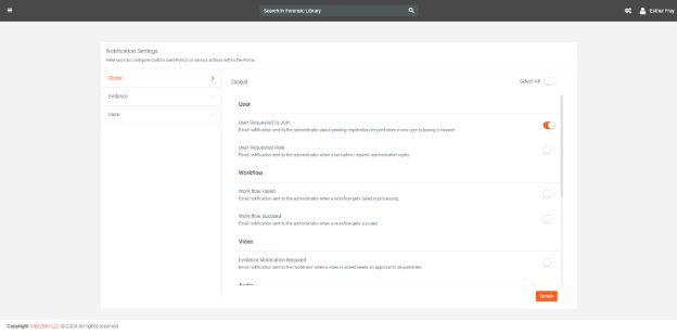 A user who is authorized to receive Alerts will also be able to manage settings for these notifications. Before flagging any evidence/case, users can set their default notification preferences via User Profile section - which will then be applied on all evidence or case that they flag from that point onwards.