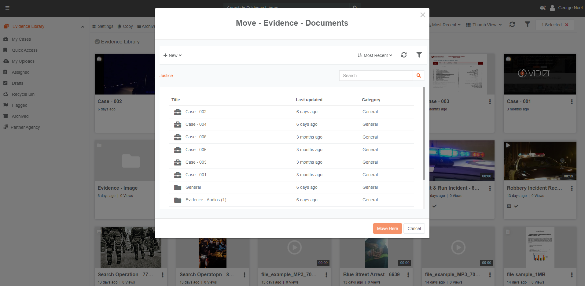 Vidizmo now enables the users to move large folders, that is, folders with thousands of evidence and folders with many sub-folders to a specific location withing the portal. If you want an evidence or folder to be a part of another case or folder or if you want to move any evidence/folder from a case, you can move that item to any desired location. By using the move functionality, bulk/single evidence & folders can be moved in folders, cases, or a folder within a case. The moved evidence or folder will no longer exist on its original location. From the move functionality, the user will be able to navigate up to N-Level folders.