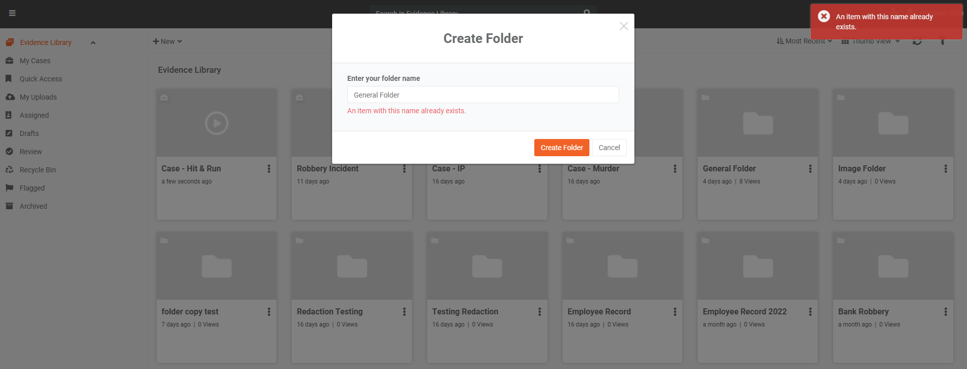 The title of each evidence, folder and case must be unique to facilitate the quick retrieval of the media and to avoid confusion. To provide you ease, VIDIZMO now restrict you to add two evidence of same format at one location. Same is with the cases and folders. To maintain the uniqueness of content, an iterator will be added by default to the newly added file on the same location.