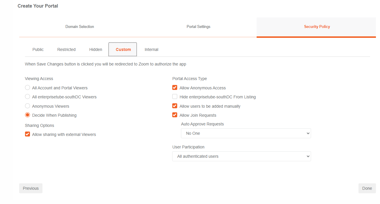 The Security Policy tab allows Administrators and Managers to define governance controls that determine who can access the Portal and view media published in the library. Security Policies are preset configurations based on typically what customers require including a Custom option for those who prefer to customize their settings to meet specific business requirements. These preset Types are: