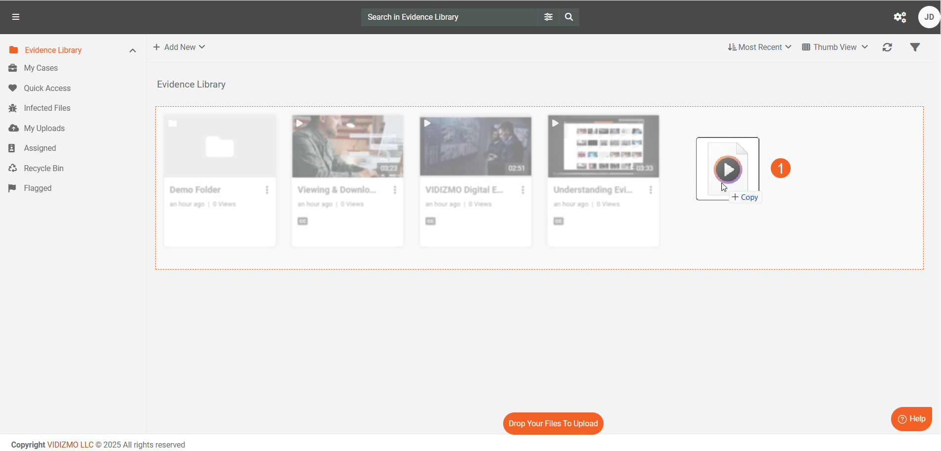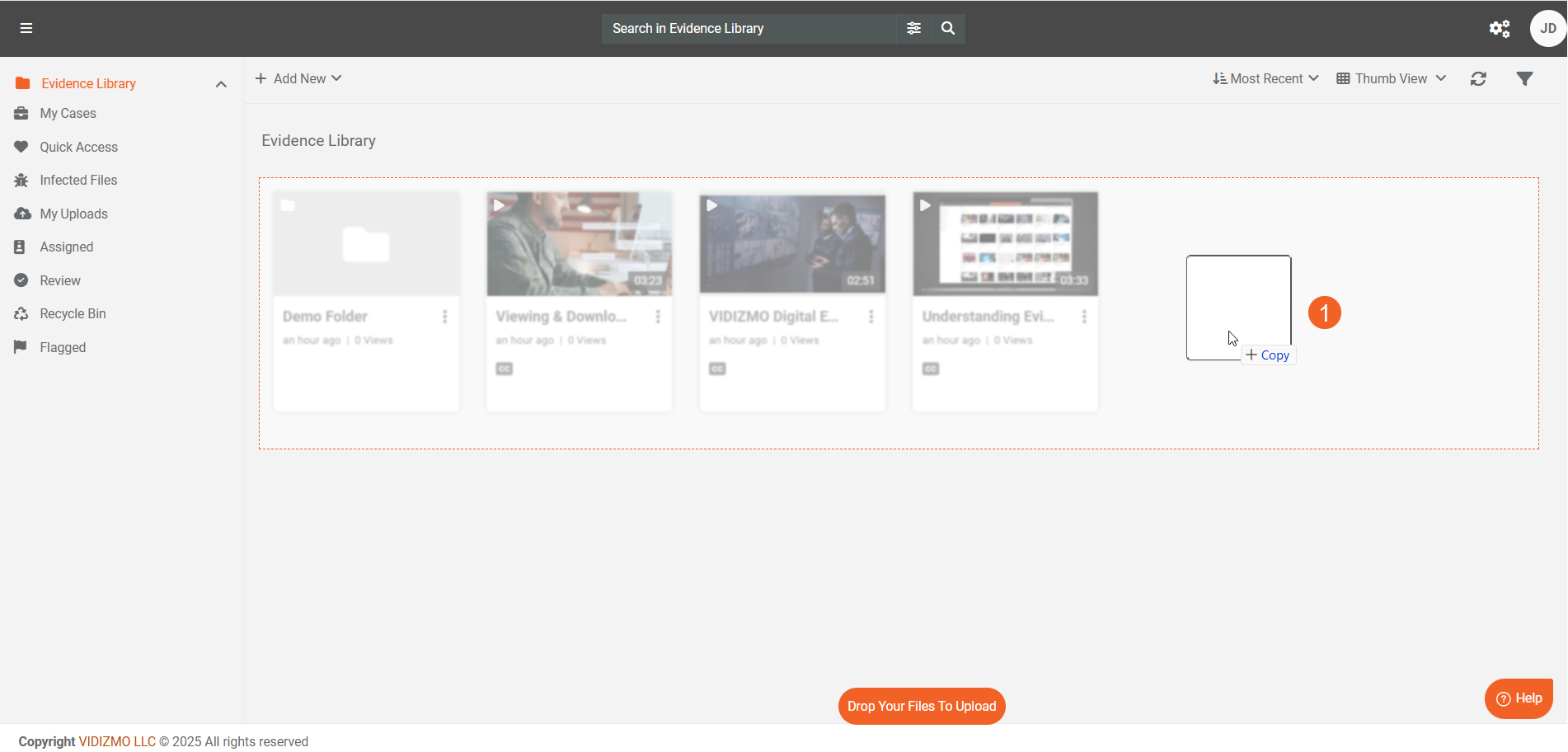 VIDIZMO offers a convenient way for users to upload their content directly to the Portal. Dragging and dropping files simplifies adding content to the portal library, making it quicker than the traditional upload button method. The drag-and-drop feature works seamlessly across all VIDIZMO products - including Enterprisetube, Digital Evidence Management, and Redaction.