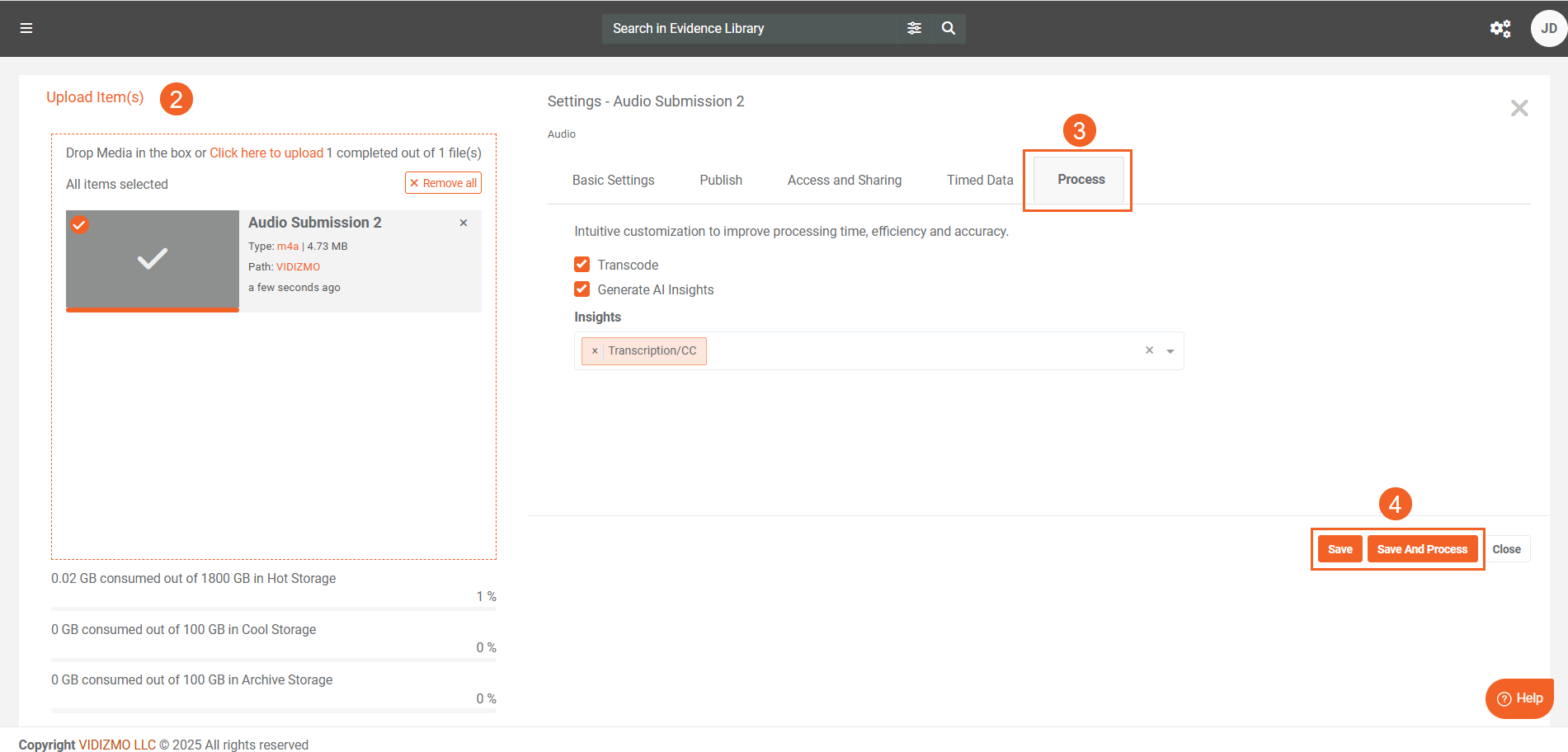 - On the upload settings page, you will see the Process Tab, which indicates that custom processing options are enabled during upload.