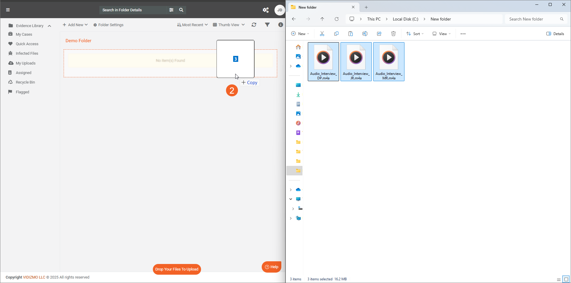 With the drag-and-drop feature, users no longer need to go through multiple pages or upload files individually to organize them into different folders or cases. Instead, they can drop their selected files directly into their preferred folder, making organizing and managing files quicker. This feature also supports bulk uploads, allowing users to drag and drop several files at once. Additionally, files uploaded via drag-and-drop follow any automatic processing or upload settings already configured on your Portal.