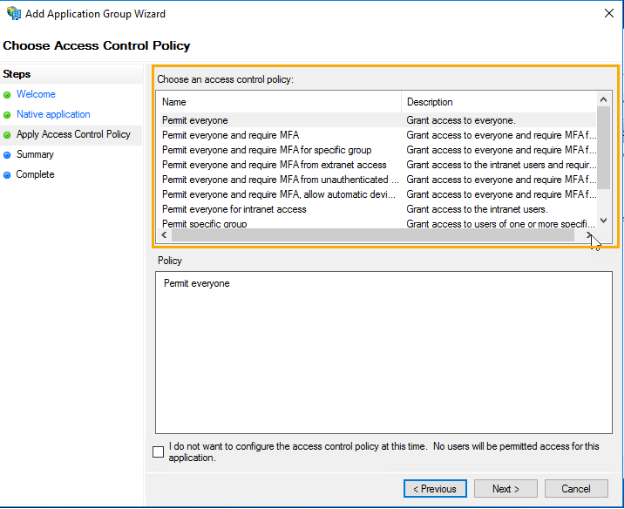 - From Choose an access control policy select the type of user group policy you want to configure. (e.g. select Permit everyone if you want to allow all your portal members to use ADFS) and select Next.
