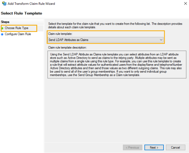 - At Choose Rule Type screen, select Send LDAP Attributes as Claims as the Claim Rule template from the drop-down list.