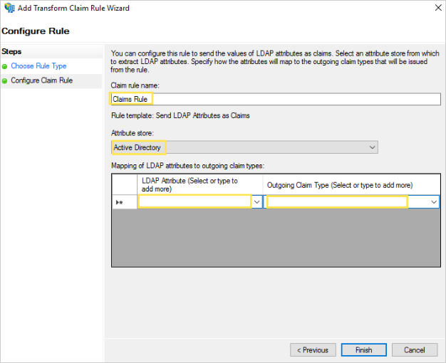 - You will move on to Configure Claim Rule screen: (Here you can configure a rule to send the values of LDAP attributes as claims).