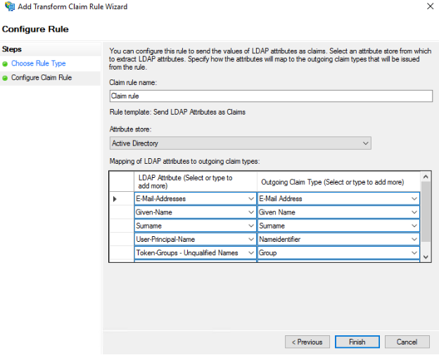 Once all the LDAP Attributes to outgoing claim types are added, select Finish.