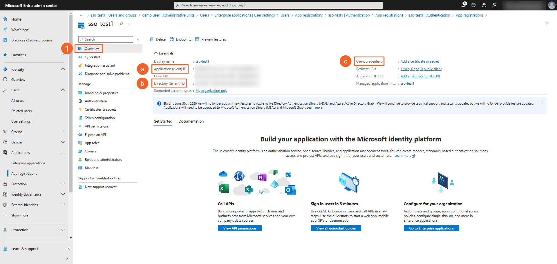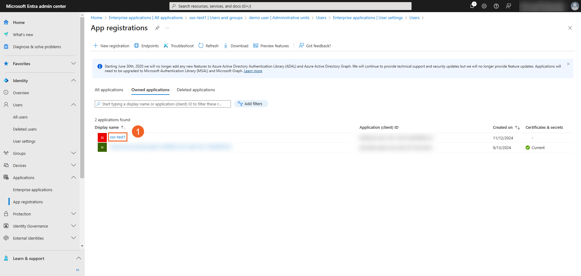 - On your Microsoft Entra admin center, click Identity > Applications > App registrations and select the application you just registered.