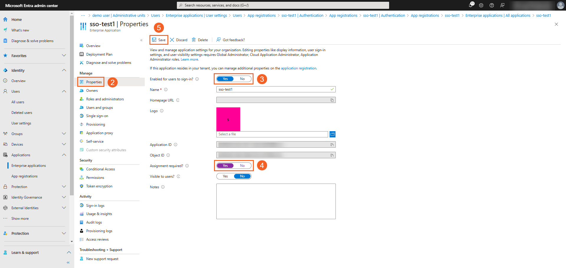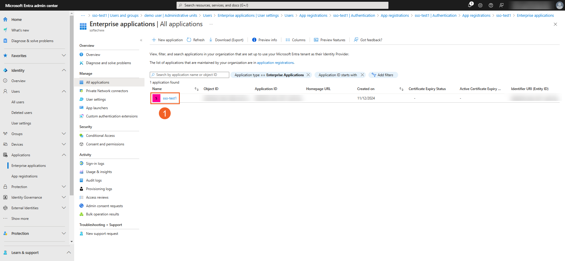 - Log into the Entra Admin Center and select your registered application via Identity > Applications > Enterprise applications.