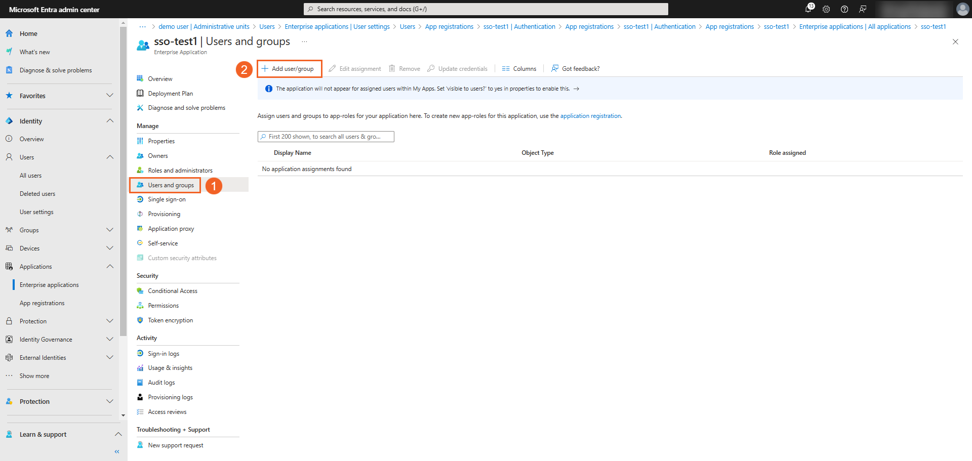 Click None Selected under users to add individual users (you need a role with Cloud Application permissions to do this). You can also assign Groups to the application that you have created in Entra. For this, you would need Microsoft Entra ID P1 or P2 with the role of IT admin with Cloud Application permissions.