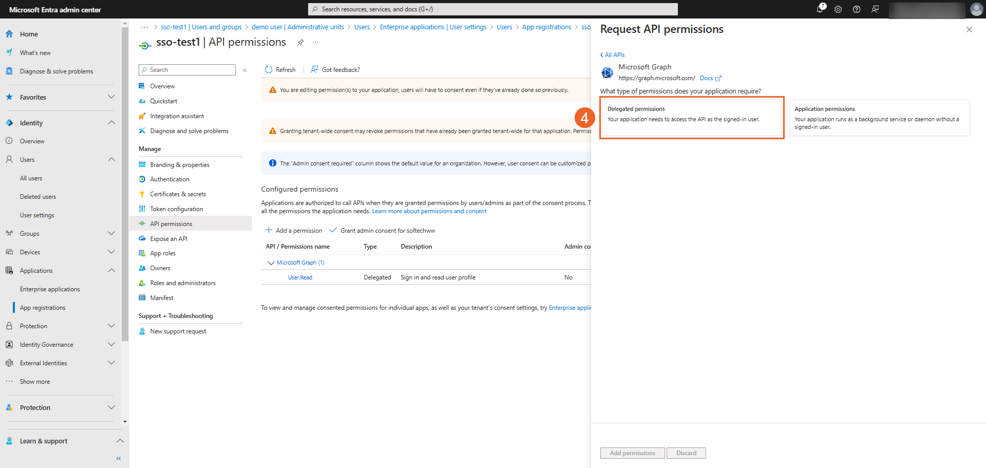 - Select Delegated permissions.