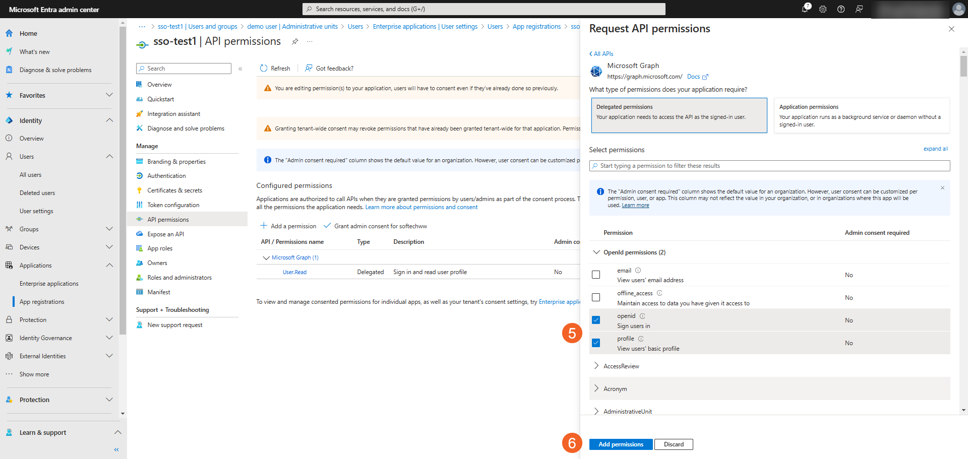Click Add permissions to add them to the application.