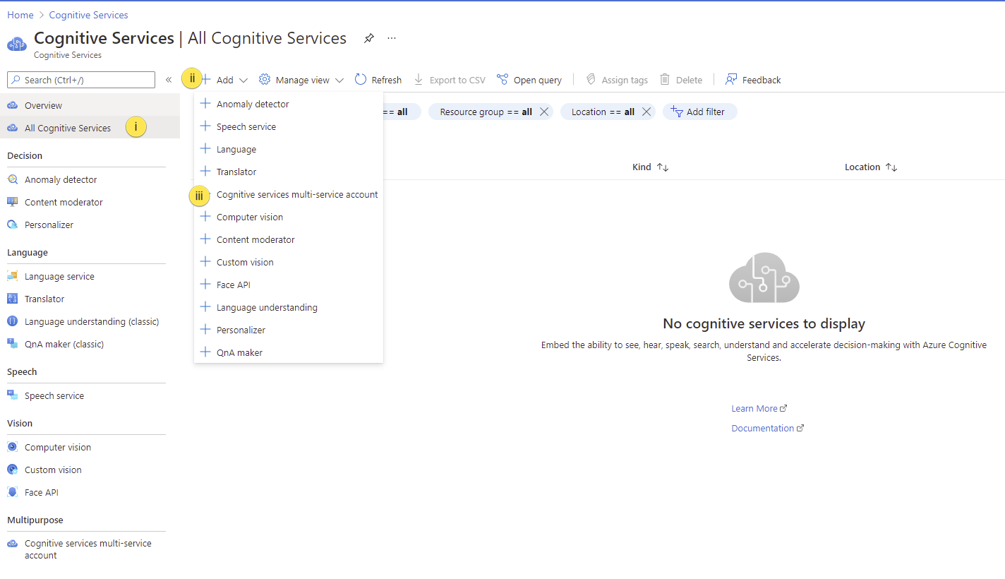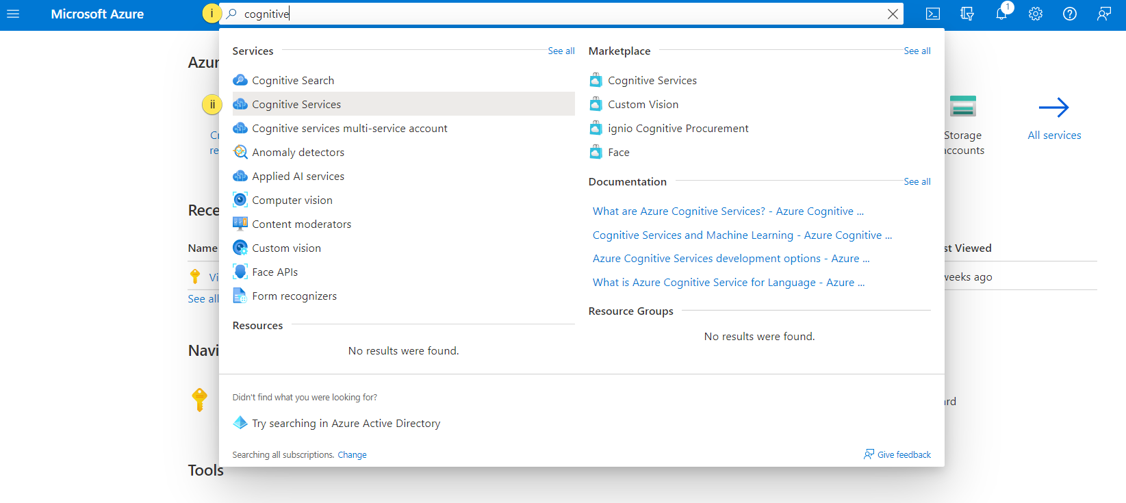 - Select the Cognitive service you want to use in your portal. For all services in a single container, use "Cognitive services multi-service account" as shown in this tutorial.