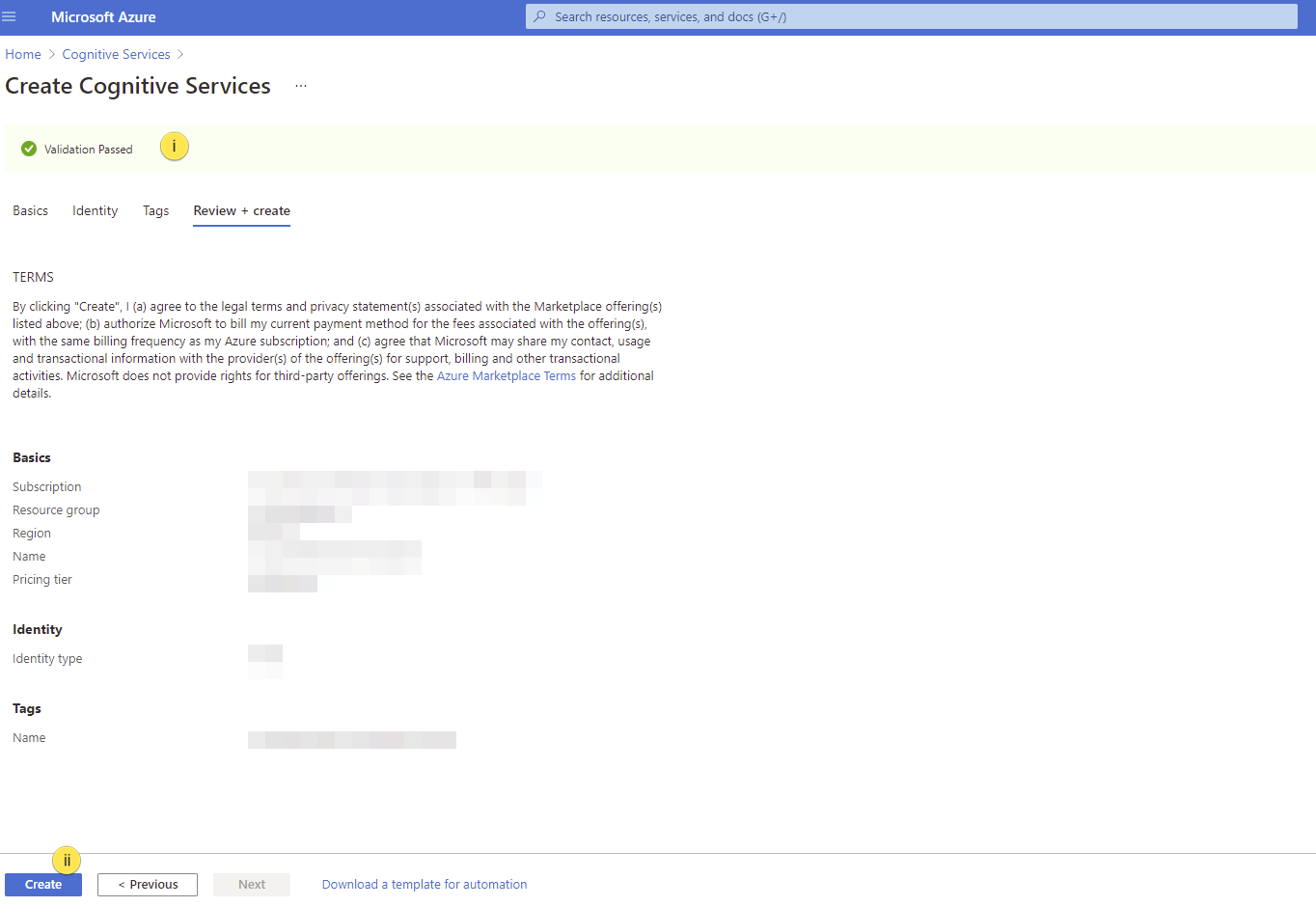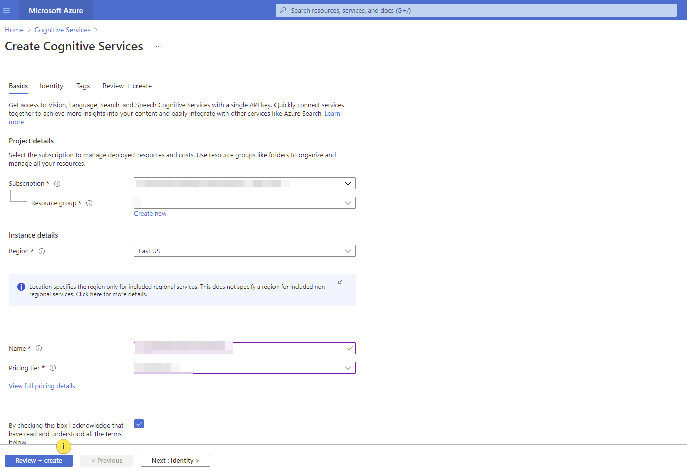 - On the Create Cognitive Services page, provide the details and select Review + create.