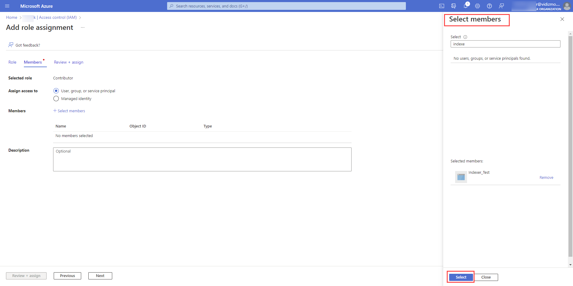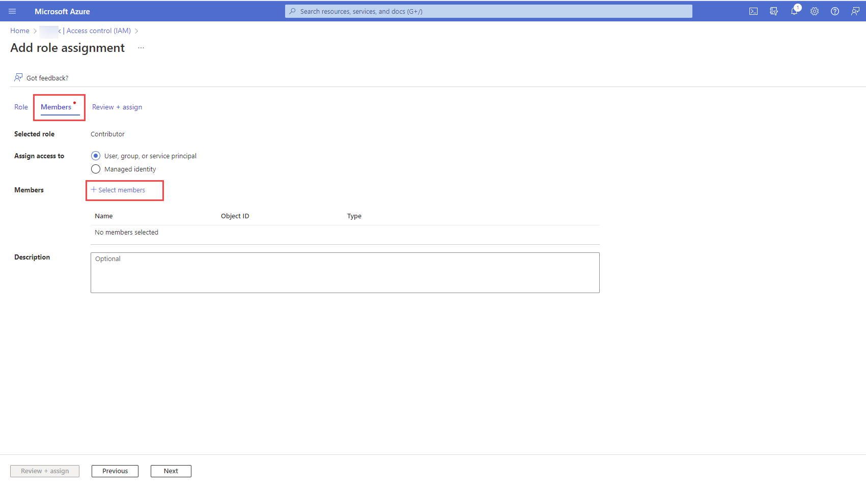 - Select the Members tab on the role assignment screen. Then select + Select members.