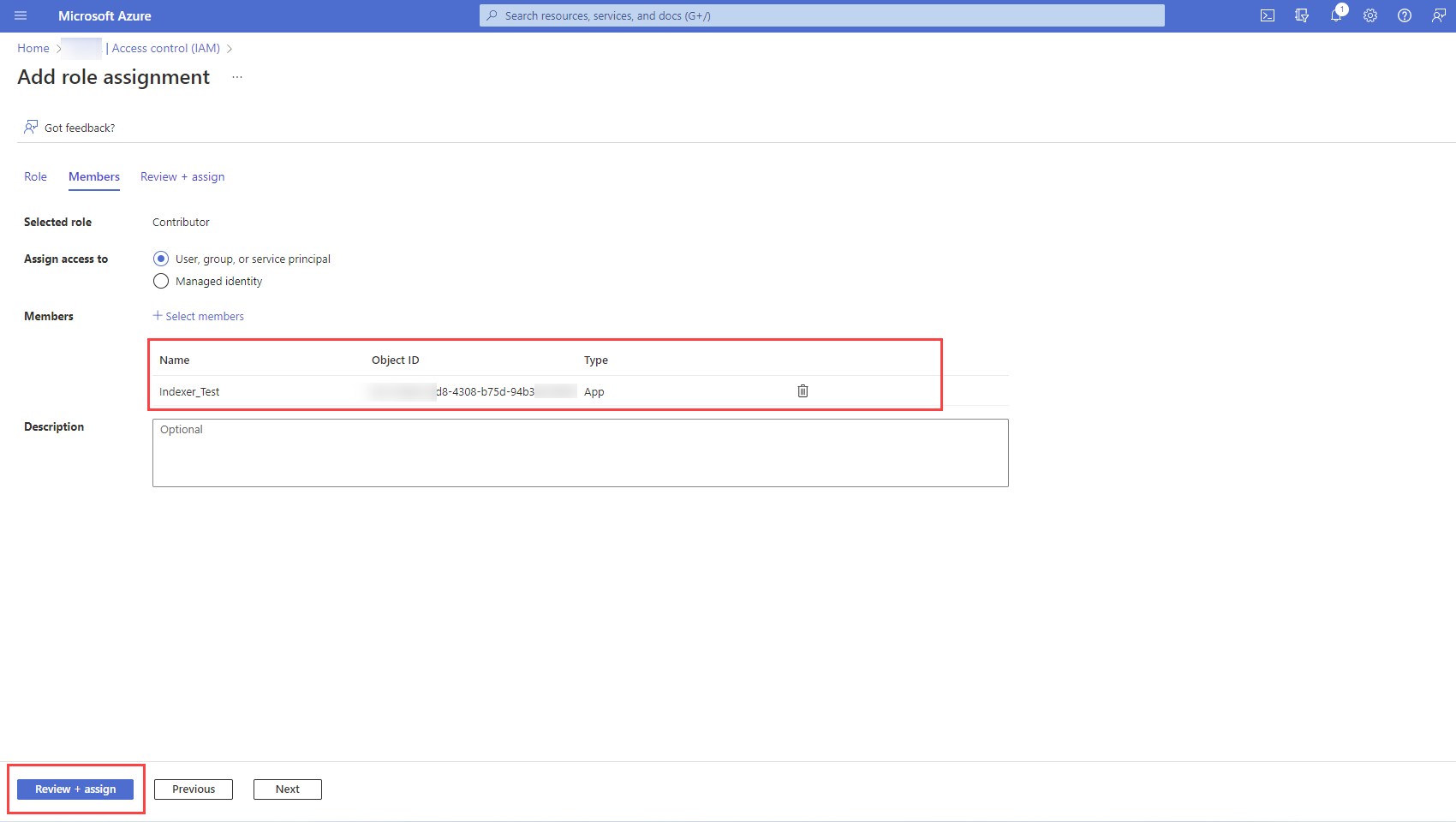 - The selected App will be shown under the "Members" section. To complete the process, select Review + assign to review and assign the permissions to the App.