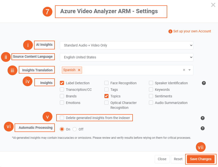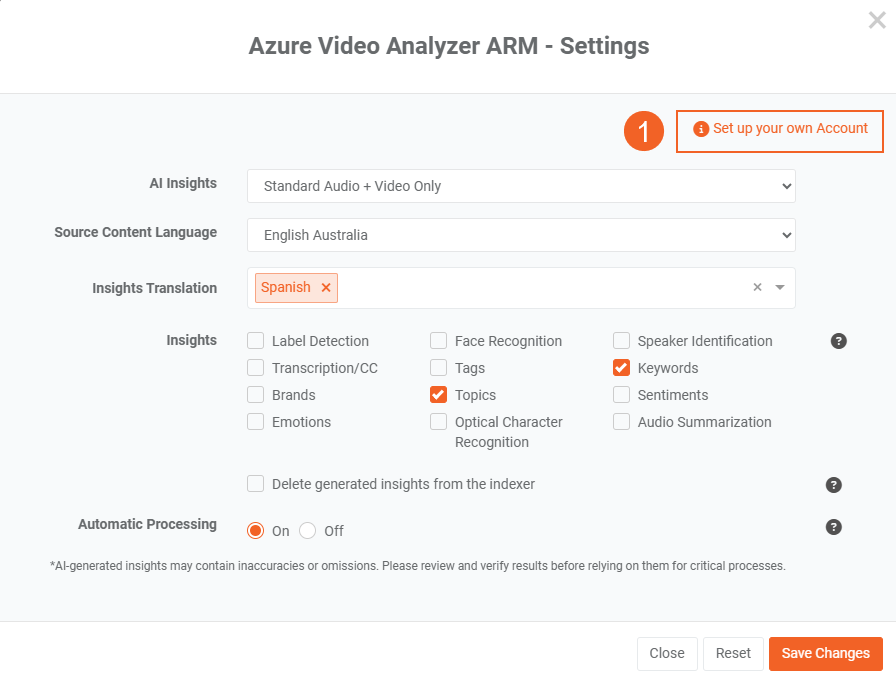 - Click the 'Set up your own account' option. In the Azure Video Indexer- Settings modal.