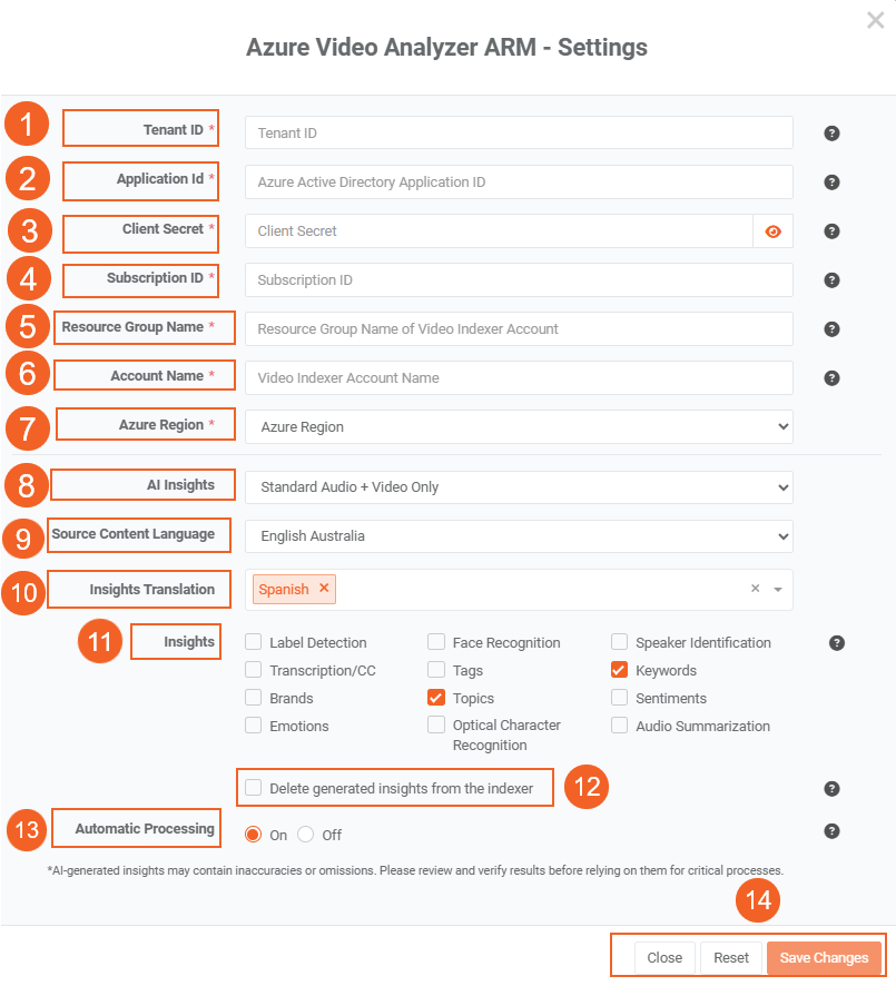 Select Insights: Select the desired insight(s) settings you wish to extract and display from either the video or audio content.
