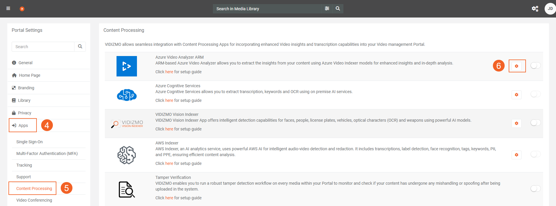 - Select Content Processing from the Apps section, where you can update the pre-configured ARM-based Azure Video Indexer.