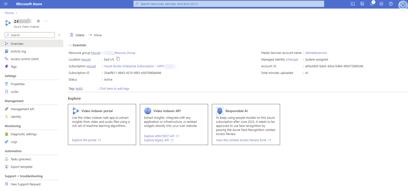 NOTE: It is important to ensure that the region of your Video Indexer account matches the region selected during the setup of your storage and media service account in Azure. Failing to do so may result in connection issues and the inability to establish a successful connection.