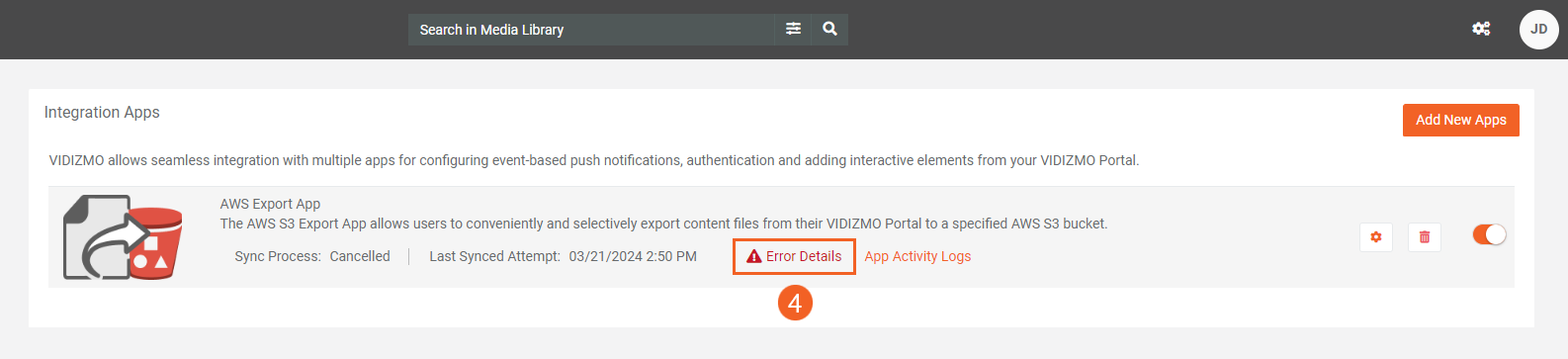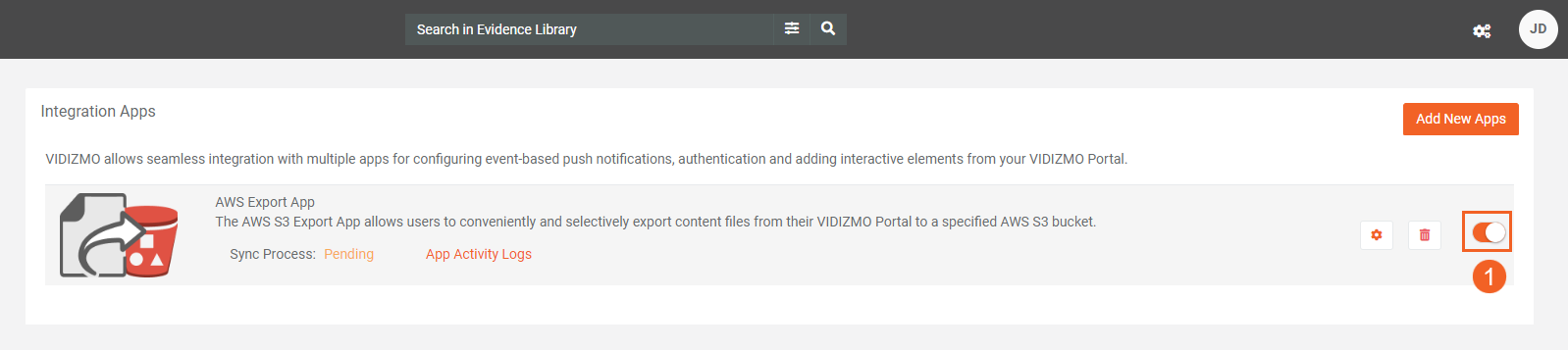 - To enable Automatic Export on your Portal, you need to activate the AWS Export App from the Integration Apps screen by turning the toggle on