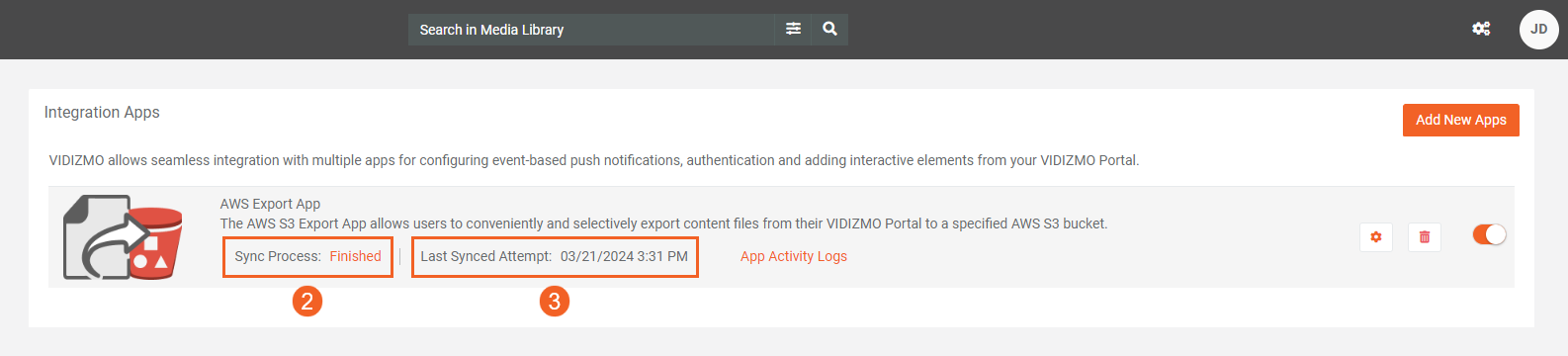 VIDIZMO provides various integration apps for different purposes, including the AWS Export App. This app lets you export specific files of your Portal content to an assigned AWS S3 Bucket. To use this app, you need to configure it with your AWS S3 bucket credentials and define the export activity you want to conduct on your Portal. This article will guide you on performing the export activity on your Portal according to your app's configuration.