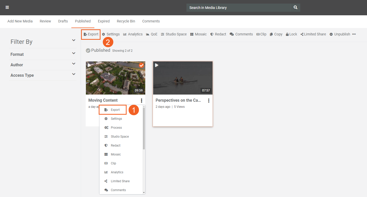 - While on your VIDIZMO Portal's Library or Manager, select Export from the overflow menu of the content to export its files to the destination AWS S3 Bucket.