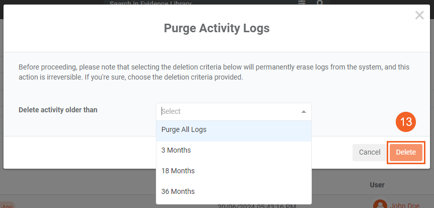 13. Specify the period for removing logs on the "Purge Activity Logs" window. If you want to remove all logs, select" Purge All Logs." To proceed with the action, click the" Delete" button.