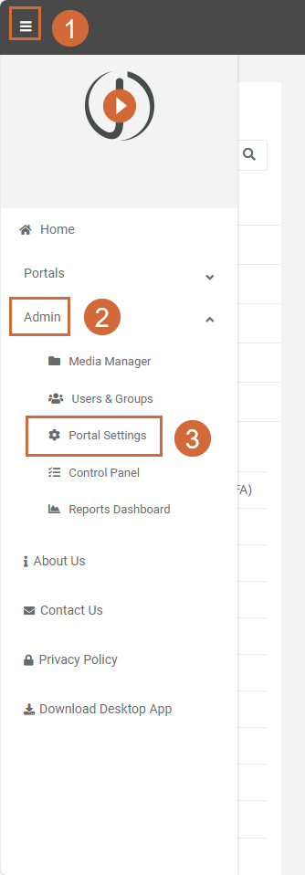 1. Click on the menu icon on the top left-hand corner of the screen to bring up the left navigation pane. 2. Then click on the down arrow to expand the admin section. 3. Select the Portal Settings from the navigation panel.