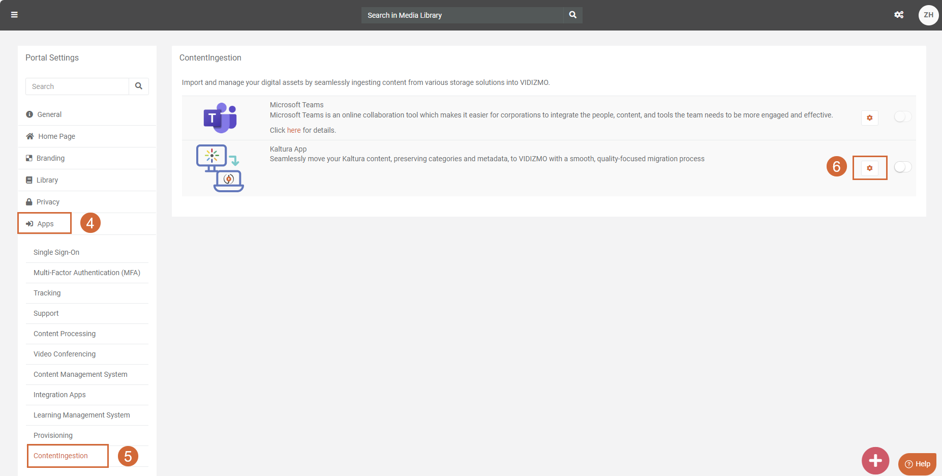 4. Click on the Apps to expand the list of application services you can integrate. 5. Select Content Ingestion, where you can set up KALTURA App. 6. Access the Settings icon for the KALTURA App to Establish Integration with VIDIZMO for Content Ingestion.