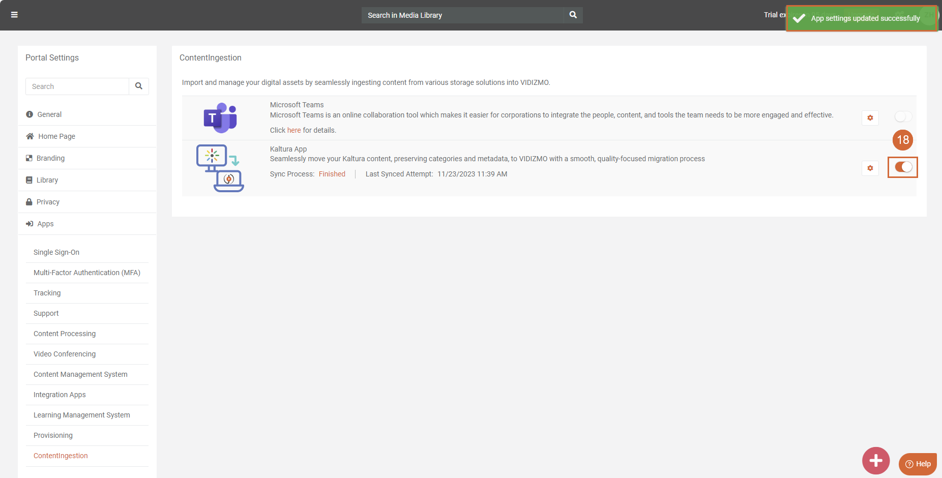 1. You can now see that the toggle button against the Kaltura App enables that toggle button to start ingesting content from Kaltura to VIDIZMO. A notification will be displayed indicating that the app settings have been successfully updated.
