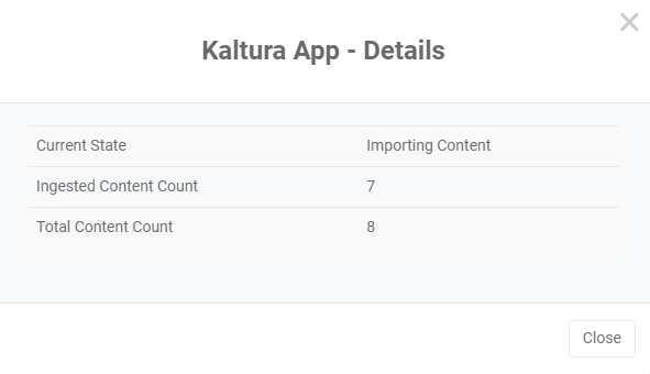 • Importing Content: In this phase, the modal displays information on the ingested content, including the count of files currently being ingested and the total content count, representing the overall number of files.