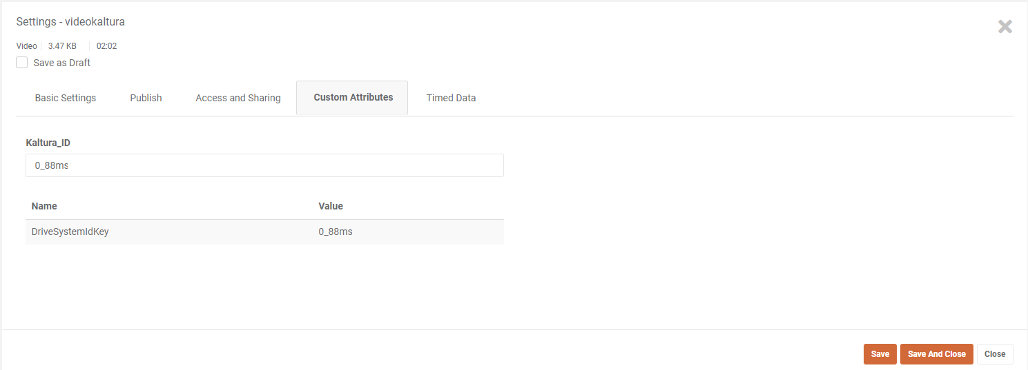 2. In the "Custom Attributes" tab, locate the custom attribute named, for example, "Kaltura_ID," which represents the source system's ID from Kaltura for that specific media file.