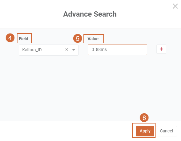In the advanced search modal, choose the field corresponding to the custom attribute name used in the Kaltura app (e.g., "Kaltura_ID").