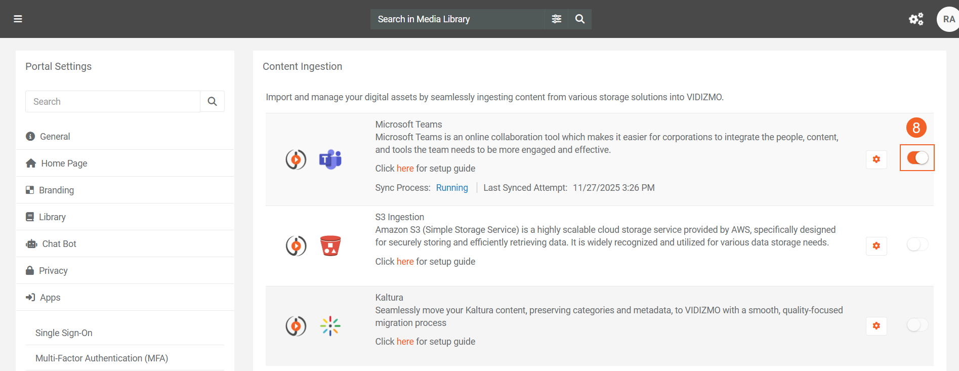 - Back on Content Ingestion, toggle the app On to activate it for your Portal.